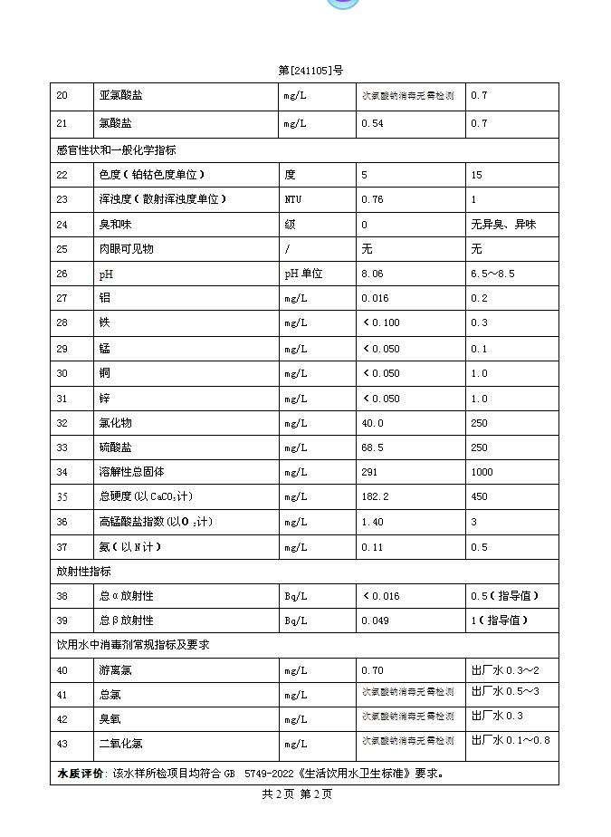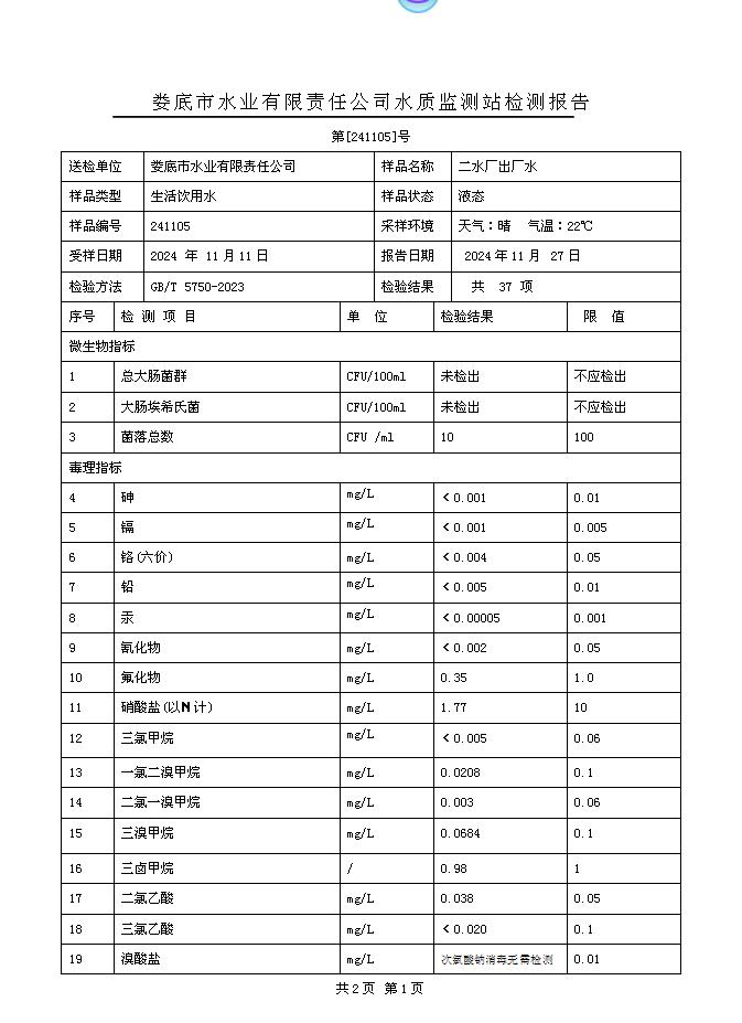 2024年11月二水廠(chǎng)出廠(chǎng)水水質(zhì)公告