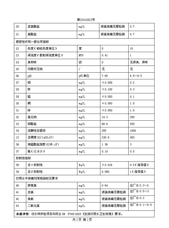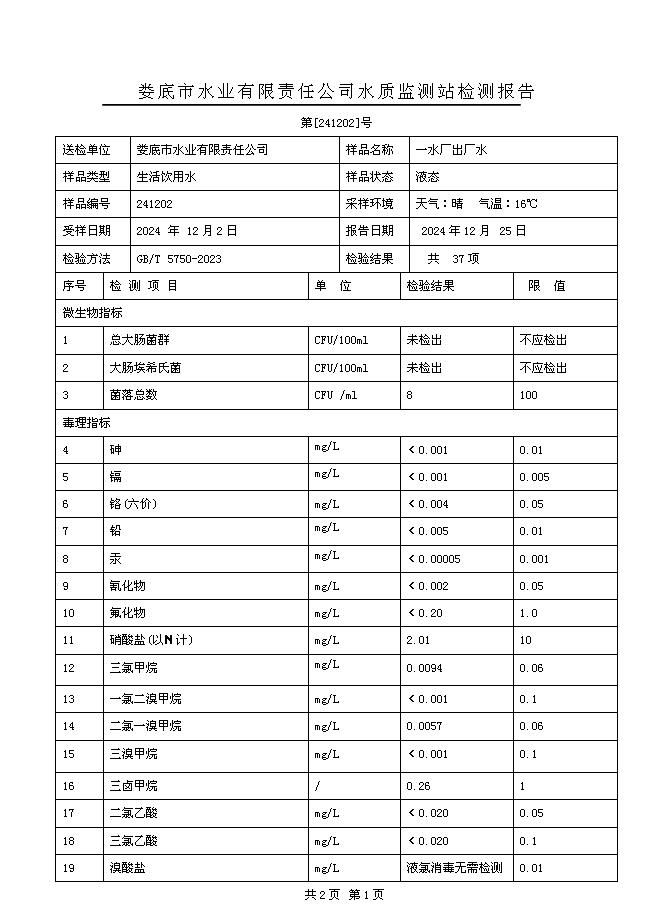 2024年12月一水廠(chǎng)出廠(chǎng)水水質(zhì)公告